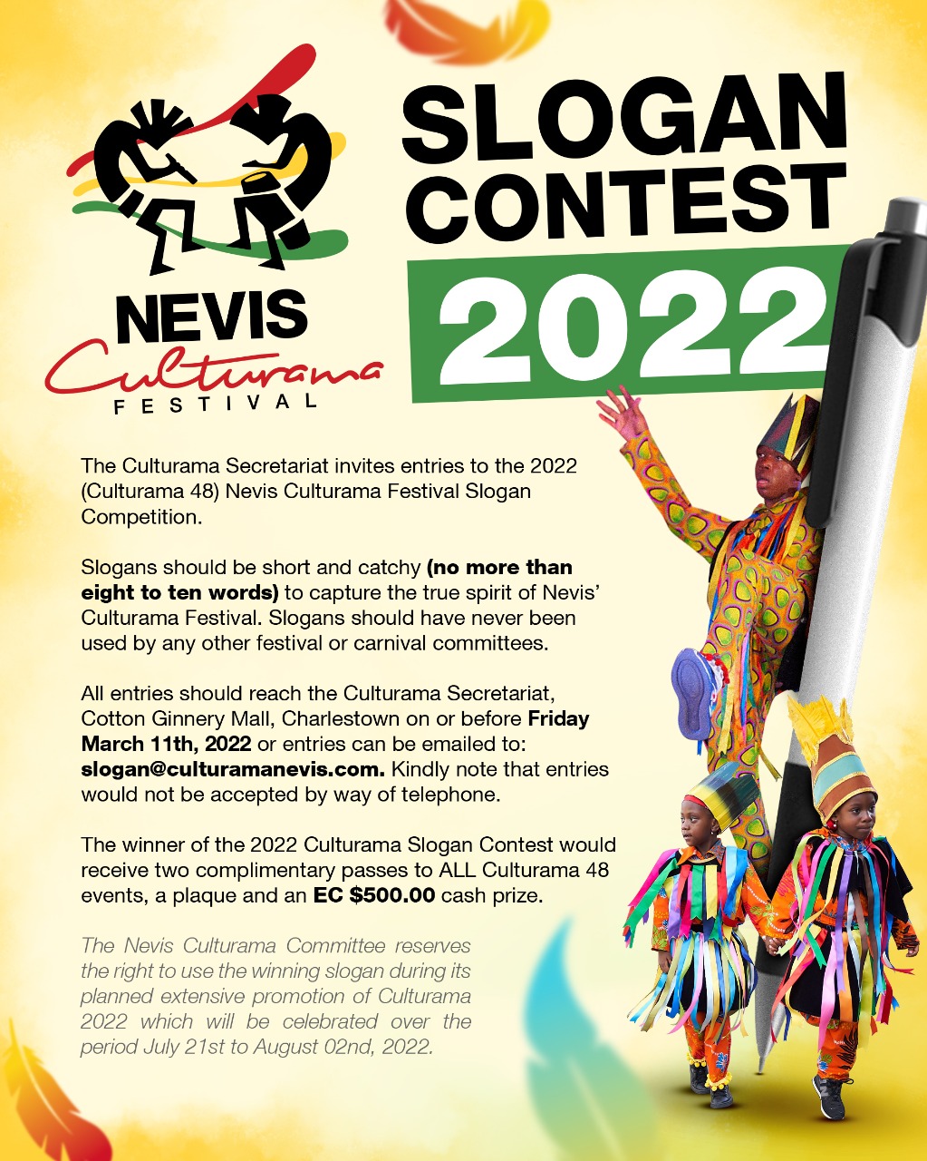 “The contest is open to all residents of Nevis. Slogans should be short and catchy – no more than eight to ten words to capture the spirit of Nevis Culturama Festival. Slogans should have never been used by any other Festival or Carnival committees. All entries should reach the Secretariat at the Cotton Ginnery Mall in Charlestown on or before 4 p.m. Friday, March 11, 2022.”
