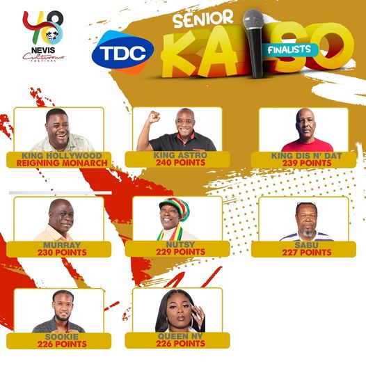 NIA CHARLESTOWN NEVIS (July 18, 2022) – Following a weekend of keen competition the finalists in the TDC Senior Kaiso Fiesta and the St. Kitts-Nevis-Anguilla National Bank (SKNANB) Soca Monarch Competition for Culturama 48 have been announced.