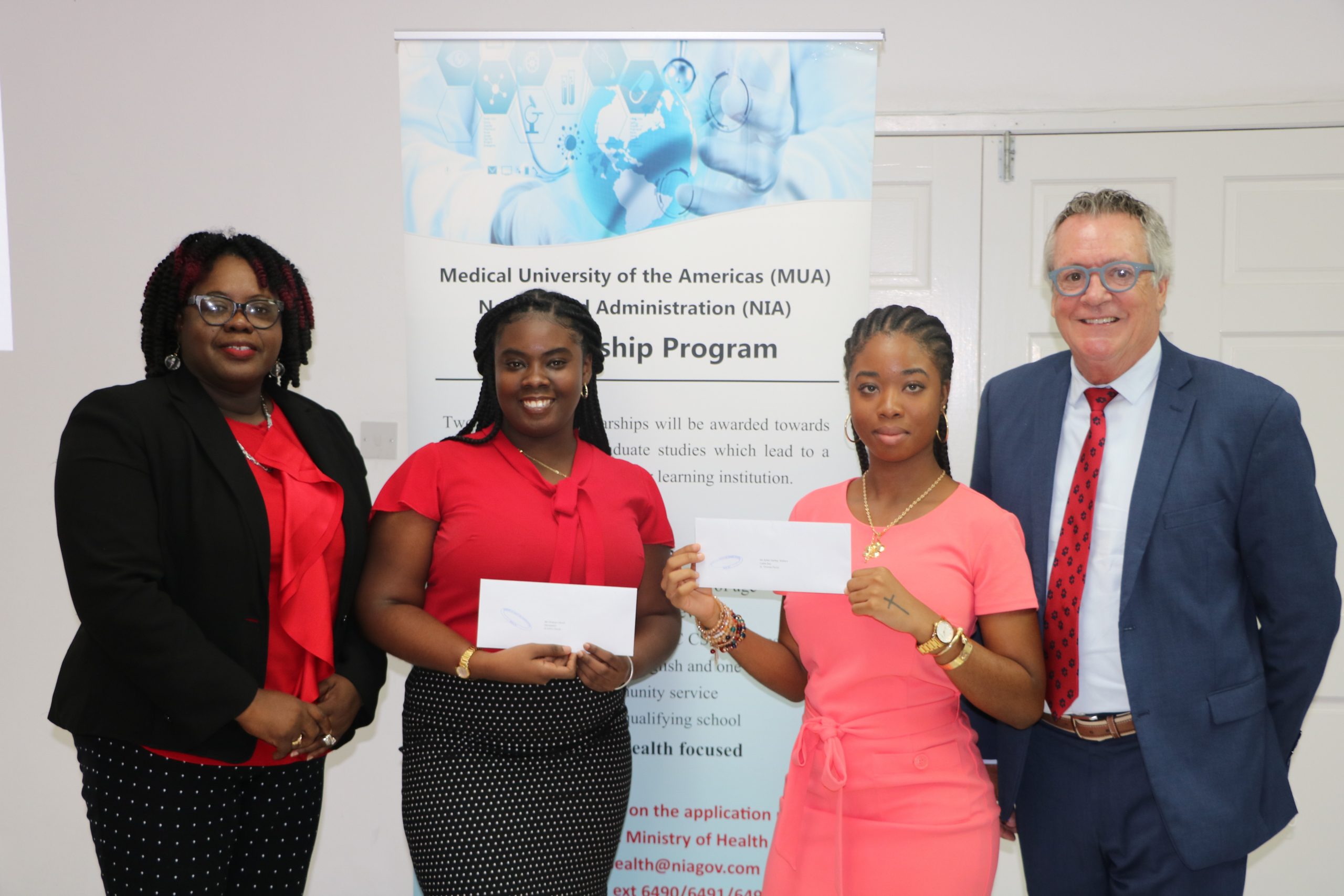 NIA CHARLESTOWN NEVIS (July 31, 2021) – – Ms. Dhakiya Liburd and Ms. Asher Walters-Hanley were on Friday, July 30, 2021, presented with Medical University of the Americas/Nevis Island Administration Scholarship Awards to pursue undergraduate degrees at regional universities.