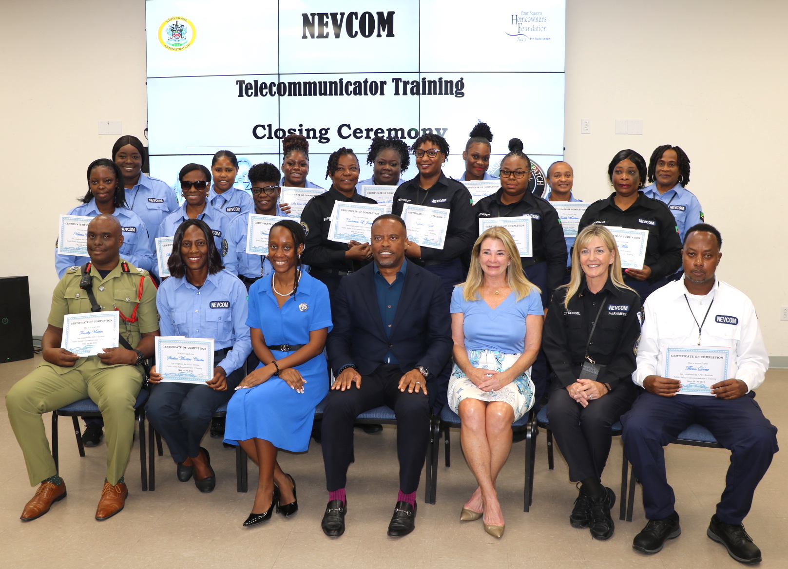 She also congratulated Permanent Secretary in the Ministry of Health Mrs. Shelissa Martin-Clarke, Deputy Fire Chief (Ag.) Mr. Timothy Martin, and Coordinator of NEVCOM Mr. Theon Drew for also passing the course and becoming certified emergency dispatchers.