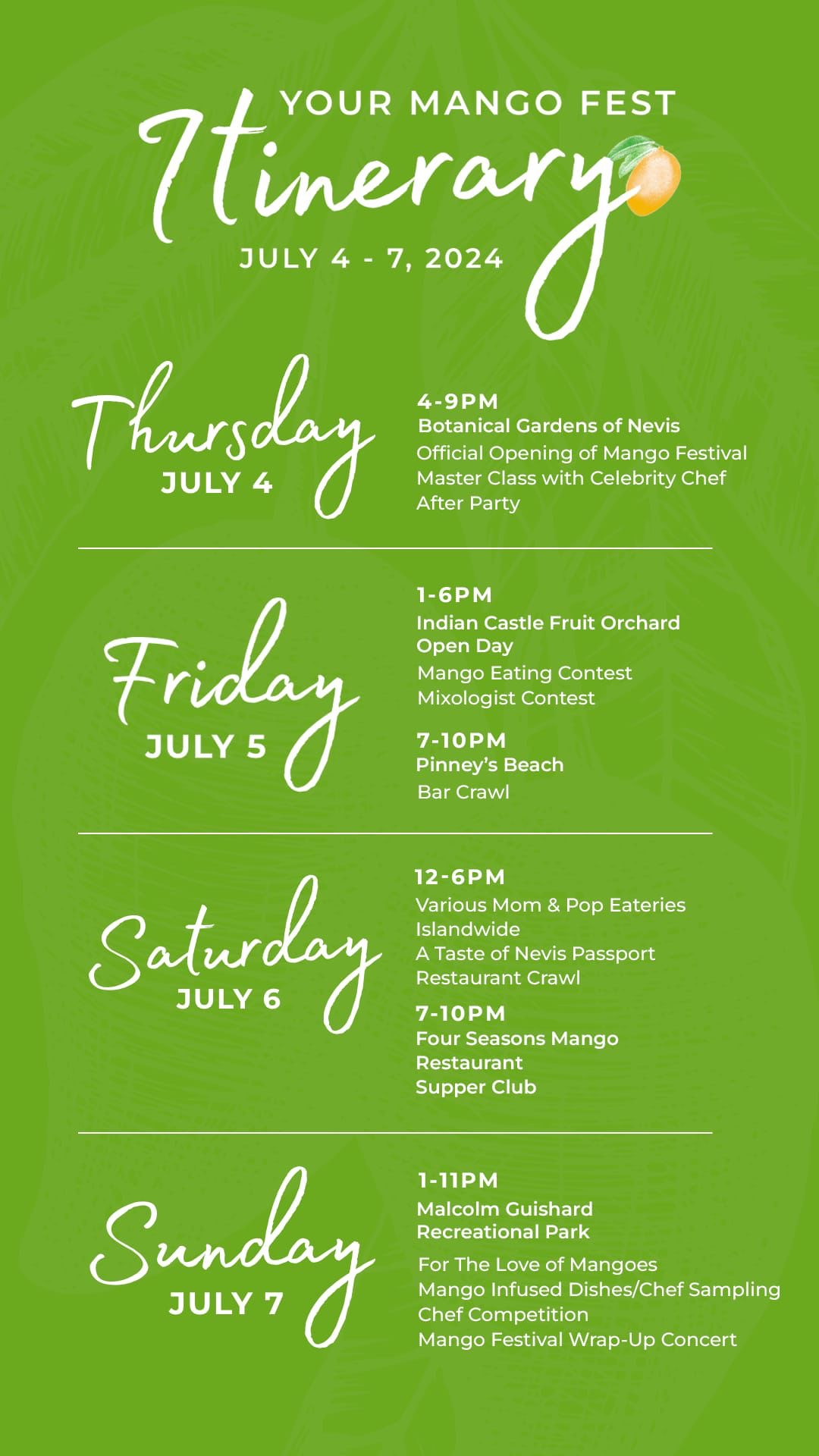 NIA CHARLESTOWN NEVIS (June 07, 2024)- The Nevis Tourism Authority (NTA) has released an exciting itinerary of activities for the tenth anniversary of the Nevis Mango Festival, which will span from July 04 to 07, 2024.