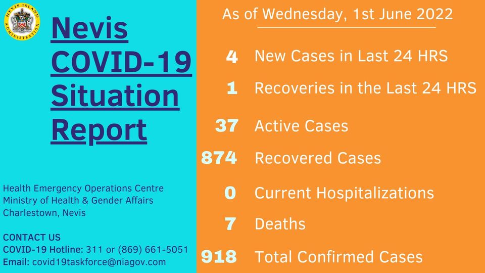 According to the Nevis COVID-19 Dashboard for Wednesday, June 01, 2022, four new cases had been reported in the past 24 hours, and one recovered case. As at that date there were 37 active COVID-19 cases on Nevis.