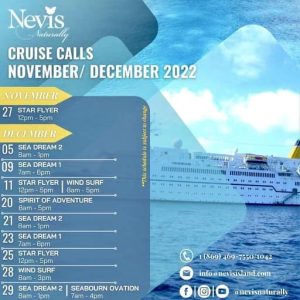 December will see eleven cruise ships calling on Nevis, including two-ship days on December 11 and December 29. With St. Kitts predicting over 1 million cruise passenger arrivals for the 2022-2023 season, Nevis is also expected to benefit from those tourists taking day-trips to the island.