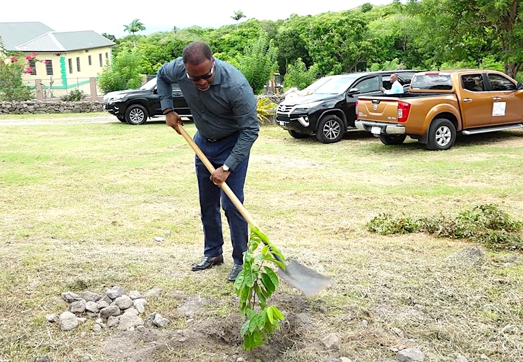 Premier of Nevis the Honourable Mark Brantley led his Cabinet along with employees from the Ministry of Agriculture and Ministry of Tourism in the tree-planting exercise held recently at the Nevisian Heritage Village in Gingerland.