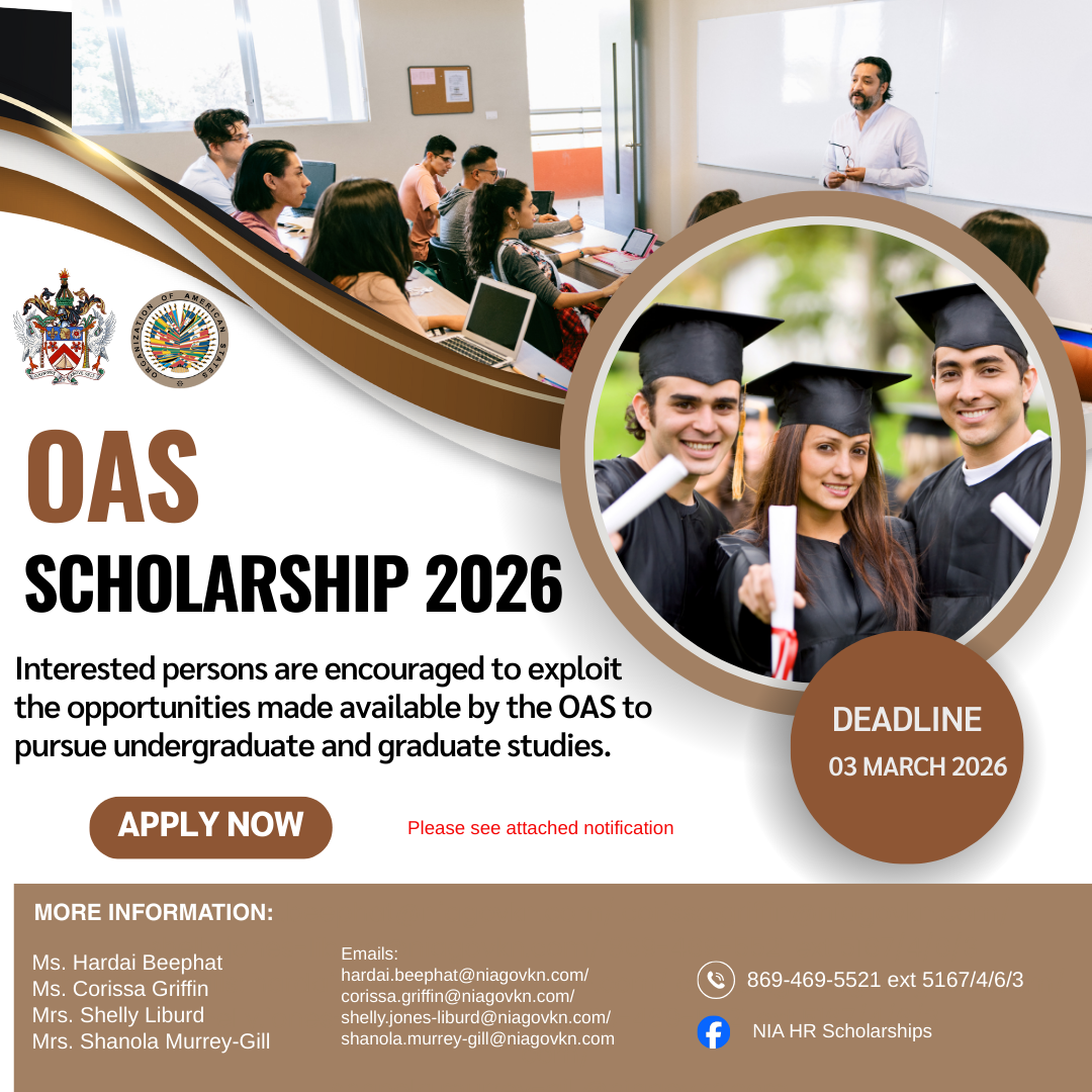 NIA CHARLESTOWN, NEVIS (March 03 2026)– The Nevis Island Administration, Ministry of Human Resources has received the call for the Organization of the American States (OAS) Scholarships 2026. Interested persons are encouraged to exploit the opportunities made available by the OAS to pursue undergraduate and graduate studies.