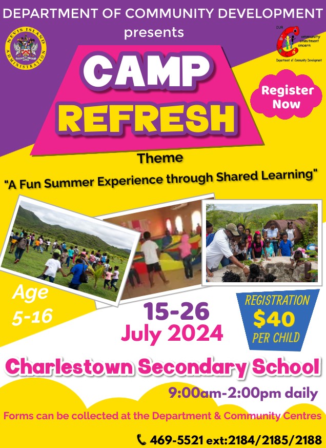 Camp Refresh will run from July 15 to 26 July at the Charlestown Secondary School. The Department endeavours to accommodate up to 100 children. Registration is $40 per child.
