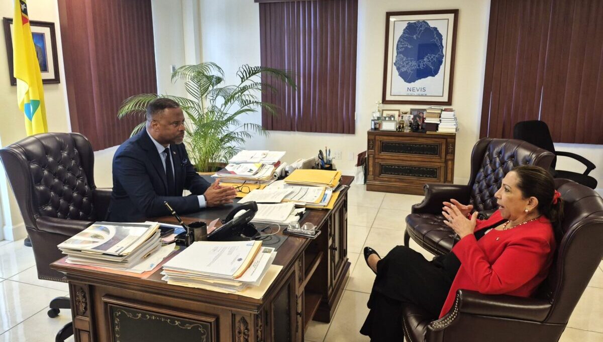 Photo caption: Premier of Nevis, the Honourable Mark Brantley, and Her Excellency Xiomara Perez, Ambassador Extraordinary and Plenipotentiary of the Republic of Panama to Barbados and St. Kitts and Nevis, engage in bilateral discussions during a courtesy call at his office on March 27, 2026
