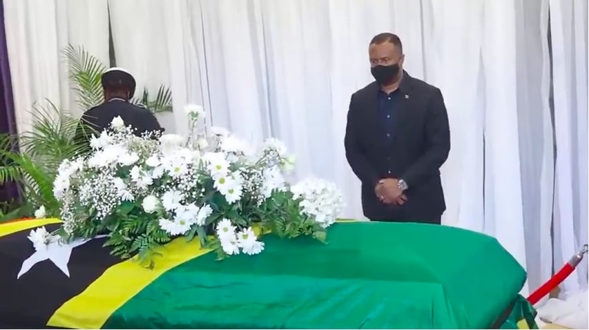 NIA CHARLESTOWN NEVIS (April 28, 2022) – – Premier of Nevis, Hon. Mark Brantley led members of the Nevis Island Administration (NIA) Cabinet to the public viewing of the body of former Premier His Excellency Ambassador Vance Winkworth Amory as it lay in state at the Theodore L. Hobson Q.C. Court Building on Thursday, April 28, 2022.