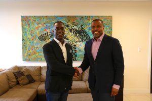 Major and his wife paid a courtesy call on the Premier at his office on Thursday, February 23, 2022, his first visit to the island since being appointed a brand ambassador for Nevis.