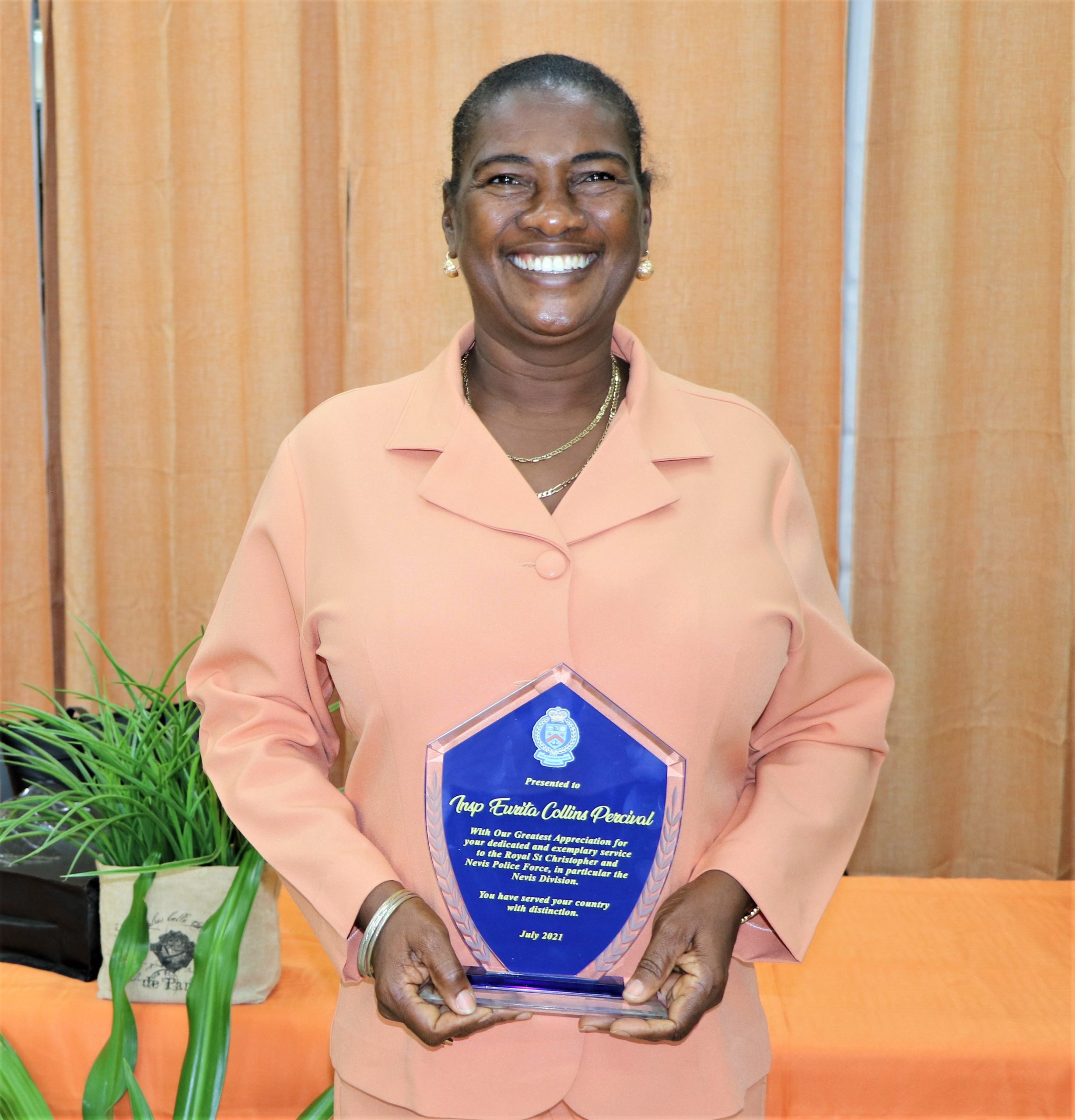 NIA CHARLESTOWN NEVIS (July 19, 2021) – Insp. Eurita Collins-Percival was on Friday, July 16, 2021, extolled for her dedicated and exemplary service as an officer in the Royal St. Christopher and Nevis Police Force during a Recognition and Appreciation ceremony marking her retirement after 26 years in the organization.