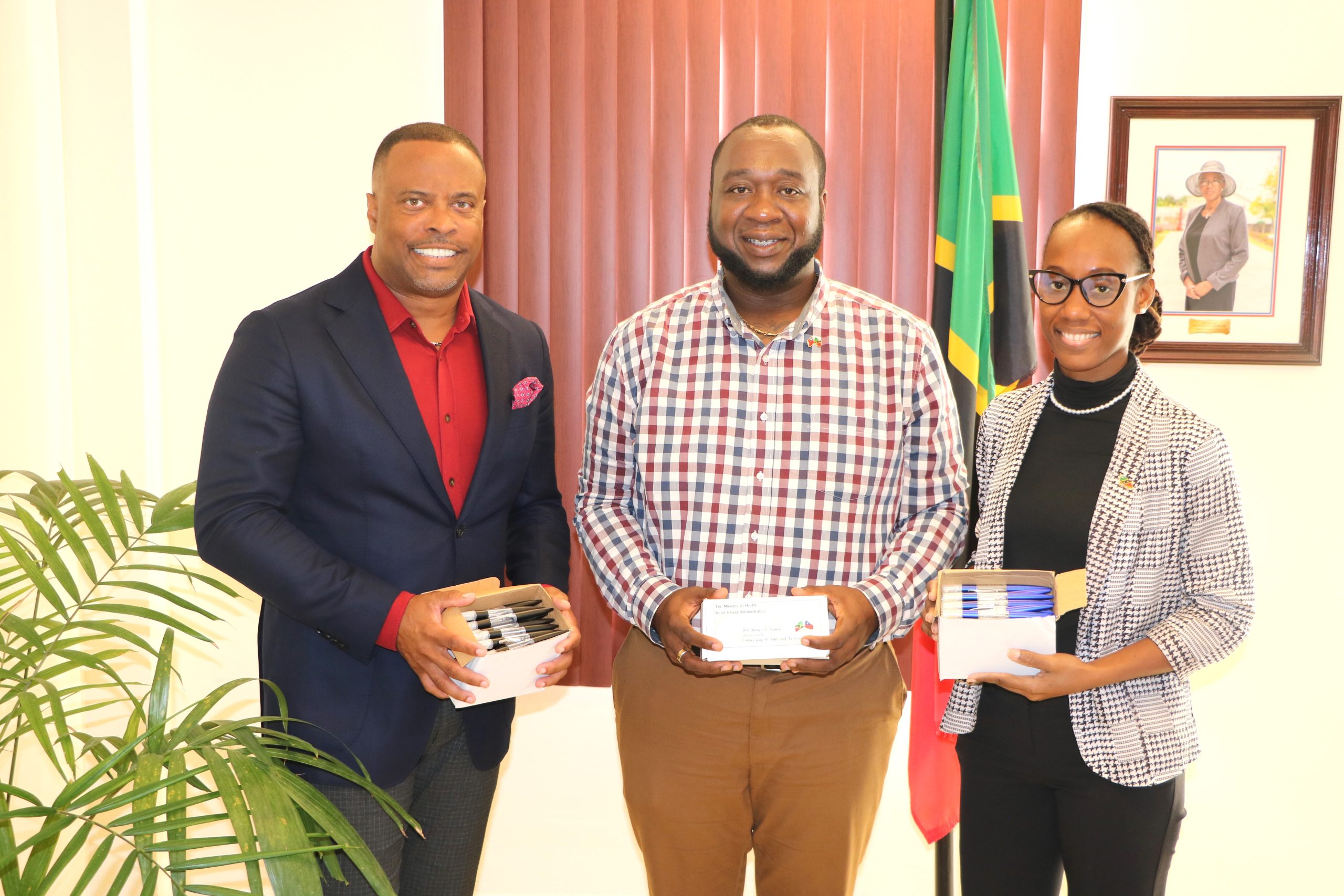 “On behalf of the St. Kitts and Nevis Embassy in Taiwan I would like to donate these pens to the Ministry of Health on Nevis. These pens are multipurpose. You can add rubbing alcohol or any alcohol-based hand sanitizer to these pens and also of course write with these pens, so you write and you clean. As a global health and development major I thought about the health professionals in St. Kitts and Nevis and said let me donate these pens so that we can reduce the instances of health institution-based infections…especially during this season when the flu and other illnesses are appearing, and Covid-19 is still lingering in St. Kitts and Nevis,” he said.