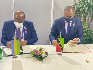 (Belgrade, October 11, 2021)– At a brief ceremony Monday (October 11, 2021) in the margins of the 60th Anniversary of the Non-Aligned Movement Summit in Serbia, the Honourable Mark Brantley, Minister of Foreign Affairs for St. Kitts and Nevis, signed a visa waiver agreement with His Excellency Mr. Pacôme Moubelet Boubeya, Minister of Foreign Affairs of Gabon.