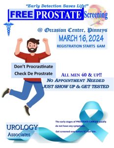NIA CHARLESTOWN NEVIS (March 15, 2024)- Urologist Dr. Dwayne Thwaites is urging men on Nevis 40 years and older to take advantage of the free prostate screening being offered on Saturday, March 16, 2024, in an effort to prevent being diagnosed with late stage prostate cancer.